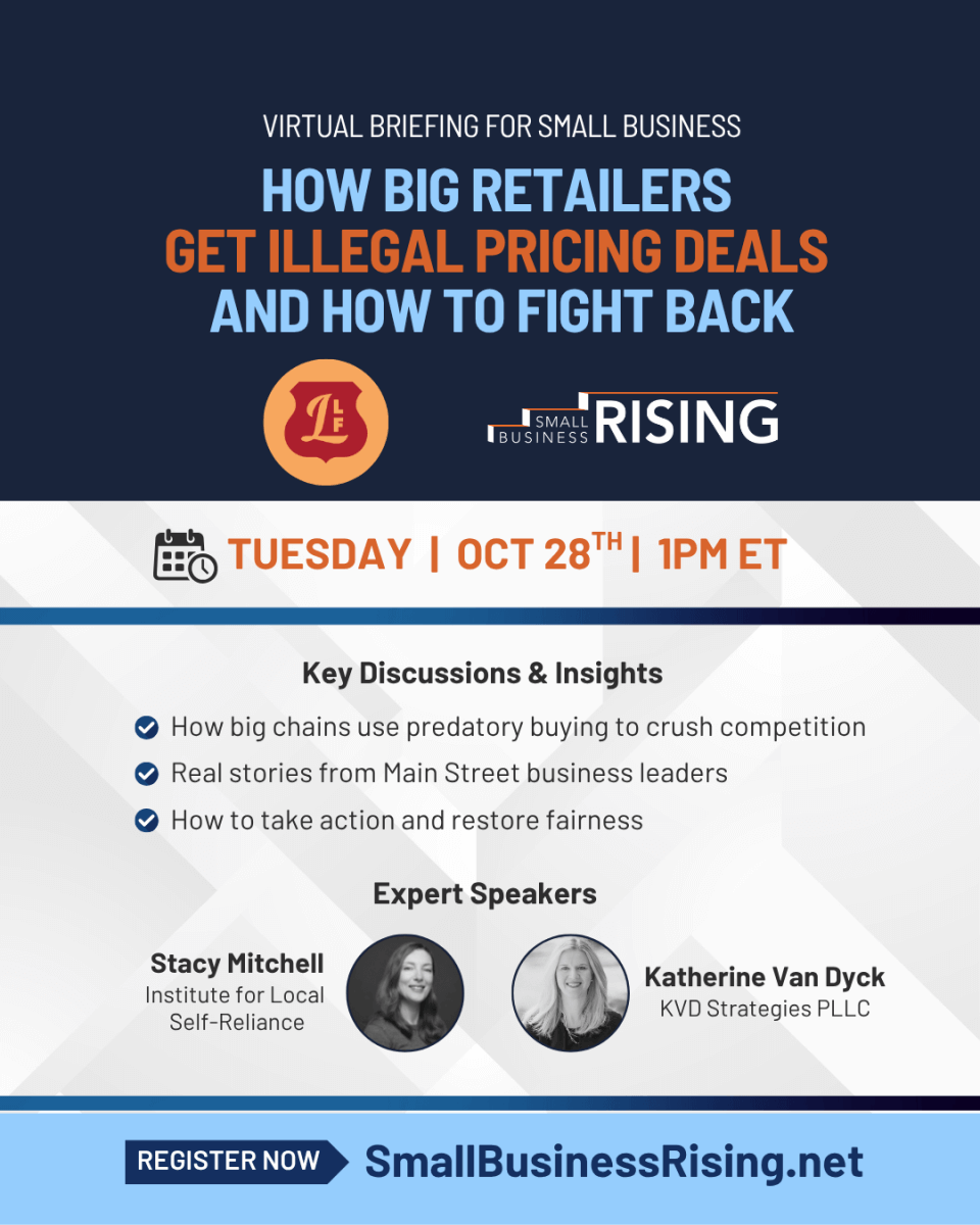 Ever wonder how Walmart, Amazon, dollar chains or other big retailers are able to set their retail prices lower than independents? You are invited to join a virtual briefing detailing how mega retailers use their market power to extract illegal pricing, access, and promotions from suppliers, allowing them to undercut small and medium competitors on retail prices. This illegal practice has been largely unpoliced, but there is a groundswell movement to fight back. Small businesses can join together to urge federal regulators to revive the Robinson-Patman Act – a law passed in the 1930s to safeguard the ability of Main Street businesses to compete.