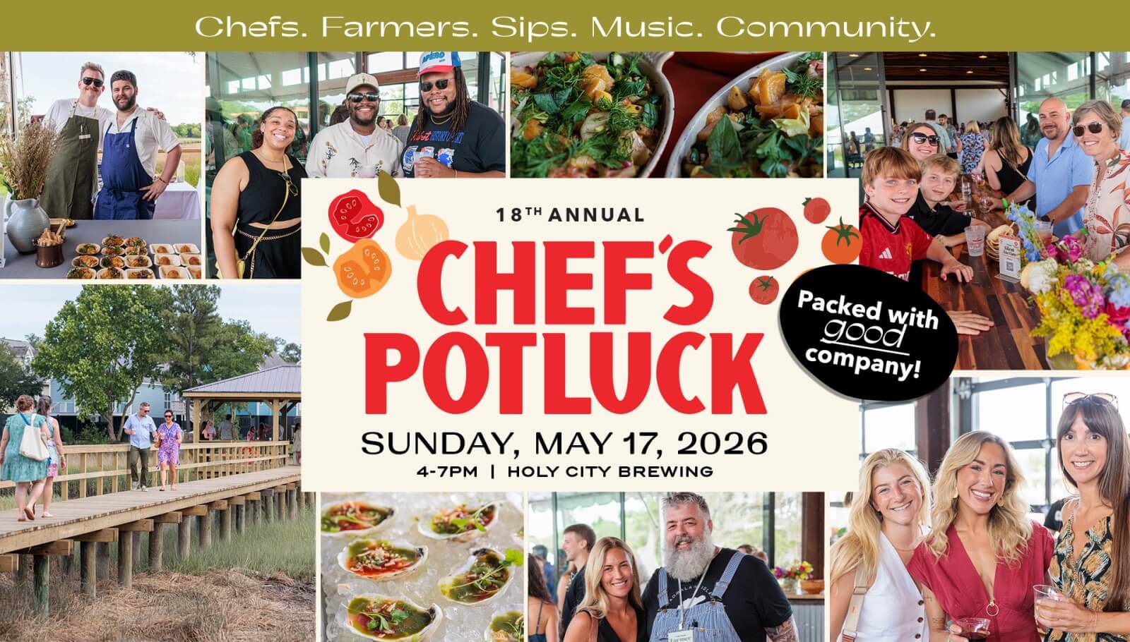 The 18th annual Chef’s Potluck is Lowcountry Local First’s largest fundraiser of the year! This event, co-presented by Indigo Road Hospitality Group and David Thompson Studio, is a joyful celebration of Charleston’s vibrant culinary scene and the people behind it. For one unforgettable evening, the marsh-side Porter Room at Holy City Brewing comes alive as 20+ of the city’s most talented chefs partner with local farmers, fishermen, and ranchers to showcase the freshest ingredients the Lowcountry has to offer.