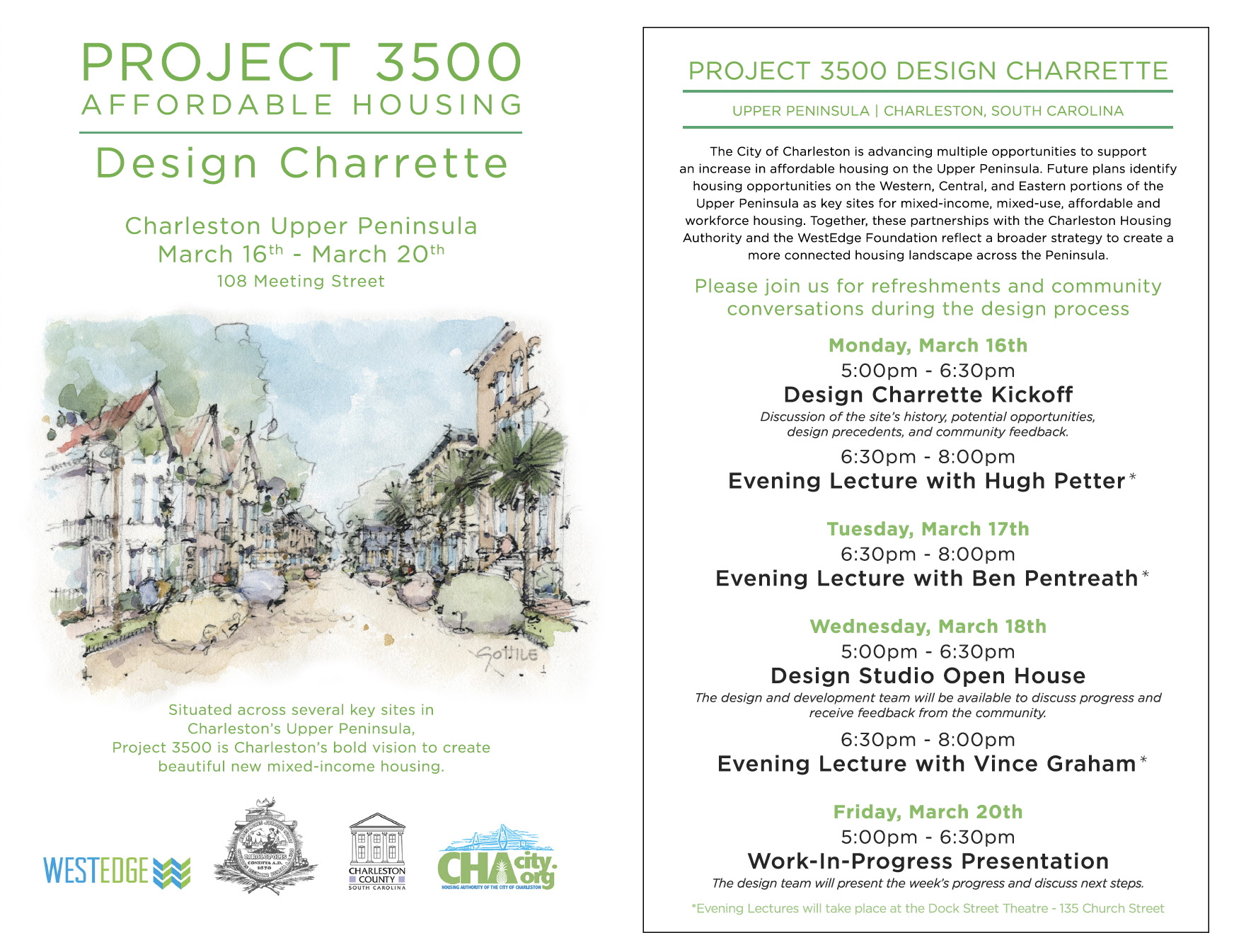 As part of Mayor Cogswell’s Project 3500 affordable housing initiative, the City of Charleston is launching a new interactive dashboard on its website, giving residents the opportunity to learn more about the project and the city’s long-term strategy for housing in our region. View the Project 3500 Affordable Housing Dashboard. The City of Charleston will be hosting a series of lectures and design charrettes March 16-20 focused on affordable housing. Learn more here.